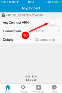 جهت قطع اتصال بر روی دکمه Anyconnect VPN کلیک کنید تا رنگ آن به سفید تغییر کند.
